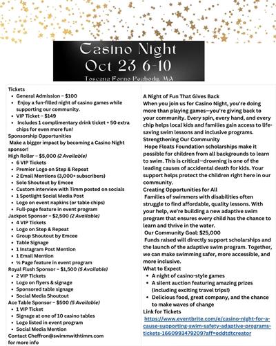 This Casino Night is more than just a fundraiser—it’s the foundation for change. Together, we’re opening doors for families, creating opportunities for all swimmers, and making sure no child is left out of the water.